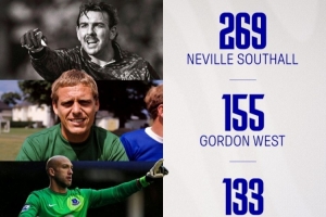 埃弗顿官方晒出俱乐部队史零封榜单,皮克福德排名第五,距离第四的萨加尔还差20场。