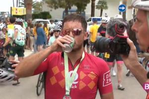 他在抵达终点后坦言:“前几公里感觉还特别好。但最后那25公里…… 我实在是骑不动了。” 疲惫不堪的他,在高强度运动后犒劳了自己一瓶啤酒。