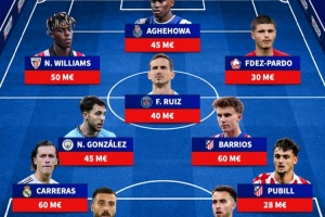 中场:尼科·冈萨雷斯(4500万欧)、法比安·鲁伊斯(4000万欧)、巴里奥斯(6000万欧)