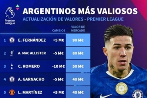体育资讯3月10日讯 德国转会市场更新了英超球员的身价,并列出英超阿根廷球员德转身价排名,恩佐9000万欧居首。