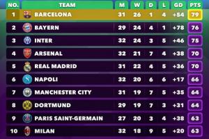 外媒列五大联赛合并积分榜:巴萨79分居首,拜仁国米枪手分列2-4