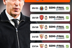 执教以来,维拉主帅埃梅里已经7次闯进欧联杯半决赛,他本赛季有望夺得第5个欧联杯冠军。除了率领维拉闯进欧联杯半决赛外,埃梅里还曾率领瓦伦西亚、塞维利亚(3次)、阿森纳以及比利亚雷亚尔闯进欧联杯半决赛。