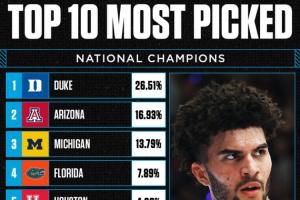 据统计,杜克大学目前是夺冠最大热门,支持率高达26.51%位居榜首。亚利桑那大学(16.93%)和密歇根大学(13.79%)分列二三。之后是佛罗里达大学、休斯敦大学、冈萨加大学、普渡大学、康涅狄格大学、阿肯色大学和爱荷华州大。排在前四的正是四大赛区的一号种子。