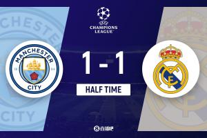 半场-十人曼城1-1皇马总分1-4落后 B席直红+手球送点哈兰德破门
